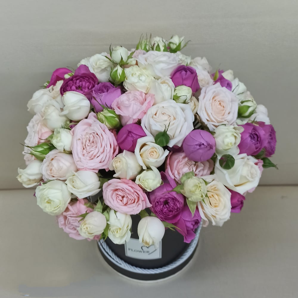 Композиция в шляпной коробке из микса нескольких сортов кустовых роз. Цветовую гамму нужно оговаривать с флористом.