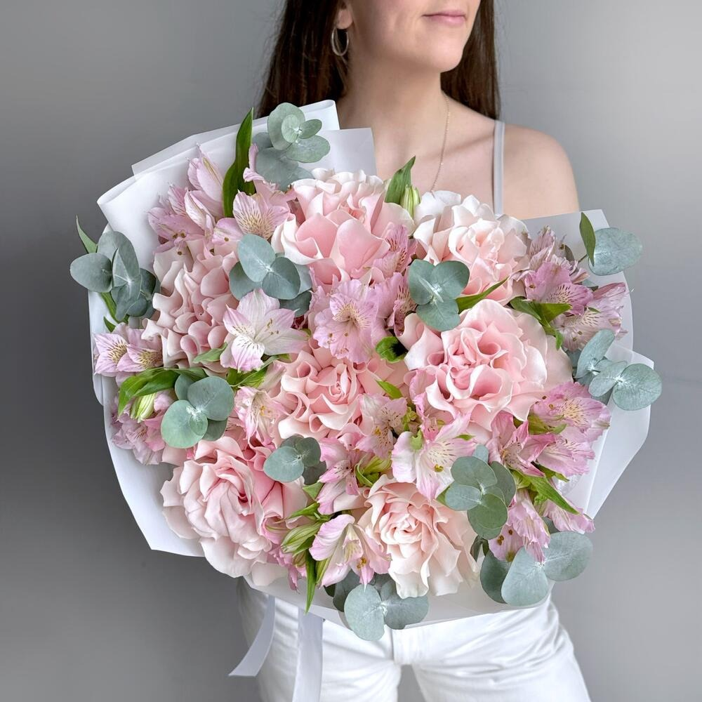 Букет «Розовая симфония» Изящная композиция из 7 розовых французских роз, 8 розовых альстромерий и свежих веточек эвкалипта — это гармония цвета, формы и текстуры. Нежные оттенки розового в сочет...