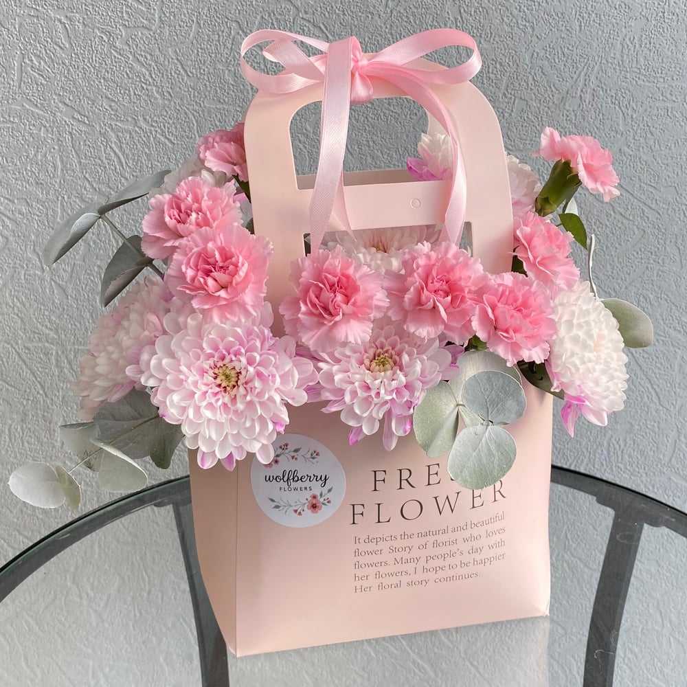 Коробка с цветами «Розовая сумочка» из хризантем и гвоздик