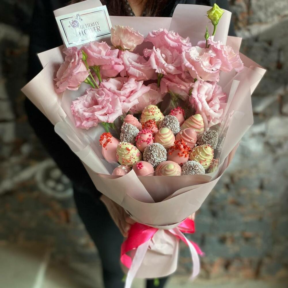 Съедобный фруктовый букет из клубники в шоколаде и эустомы в дизайнерской упаковке
