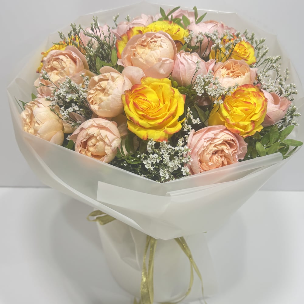 Розовая заря - это захватывающая смесь романтичных роз нежно-розового цвета, сочетающихся с солнечными желто-оранжевыми розами, символизирующими тепло и привязанность. Гипсофила добавляет нотку грации, в то время как элегантная белая упаковка подчеркивает красоту цветов. Идеально подходит для любых случаев или просто чтобы осветить чей-то день с ноткой элегантности и очарования.