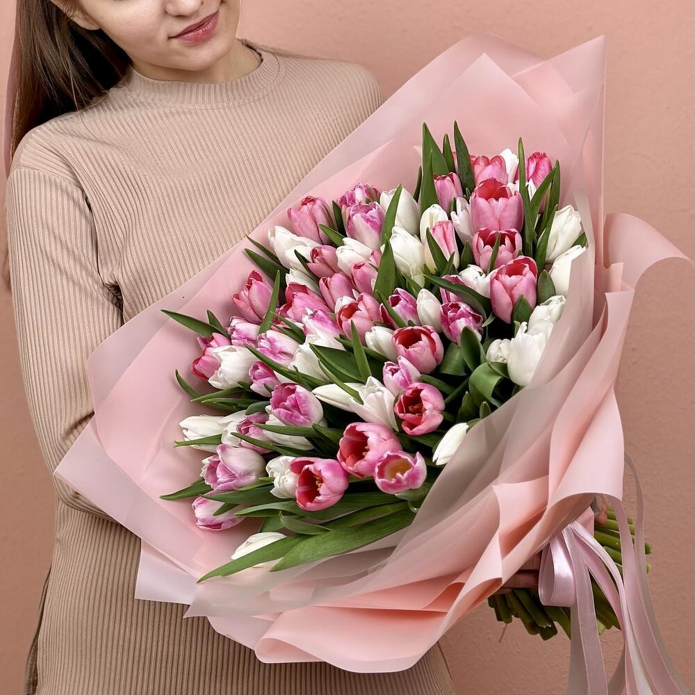 Букет «Розовое облако» от Mr. Пион 75 нежно‑розовых и белых тюльпанов — это настоящее море весенней свежести и романтики. Пышная композиция смотрится торжественно и трогательно одновременно. По...