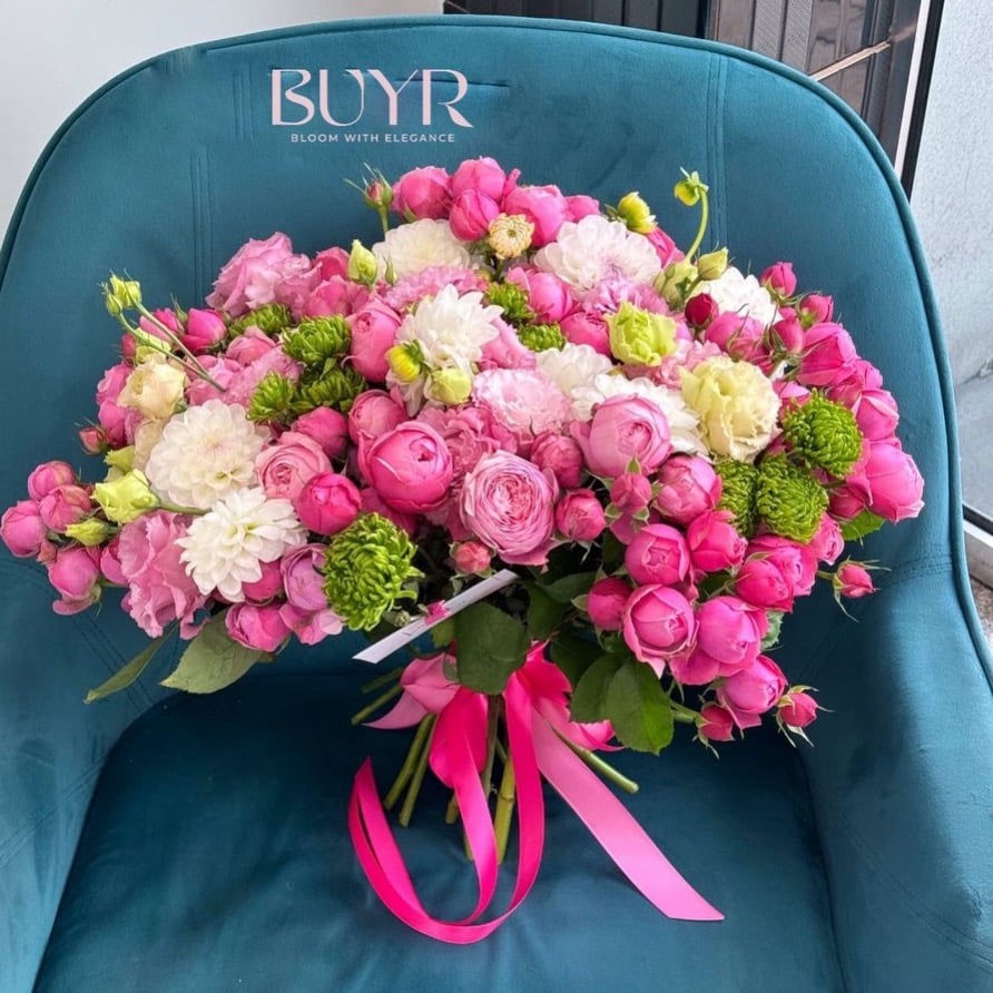 Роскошный букет в нежно-розовой гамме — сочетание пионовидных роз, эустом, белоснежных георгин и ярко-зеленых акцентов. Создан для того, чтобы дарить радость и восхищение. Этот букет идеально подо...