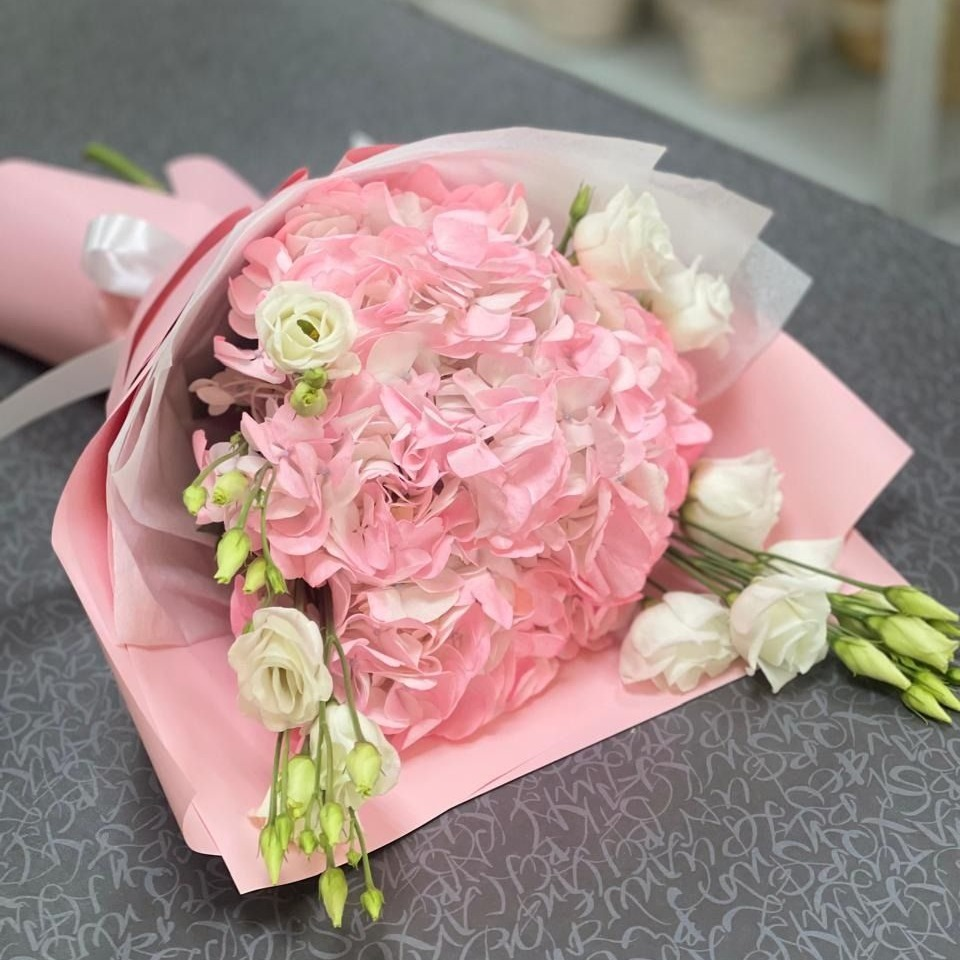 Букет из гортензии и эустомы подарит хорошее настроение и порадует любого получателя!