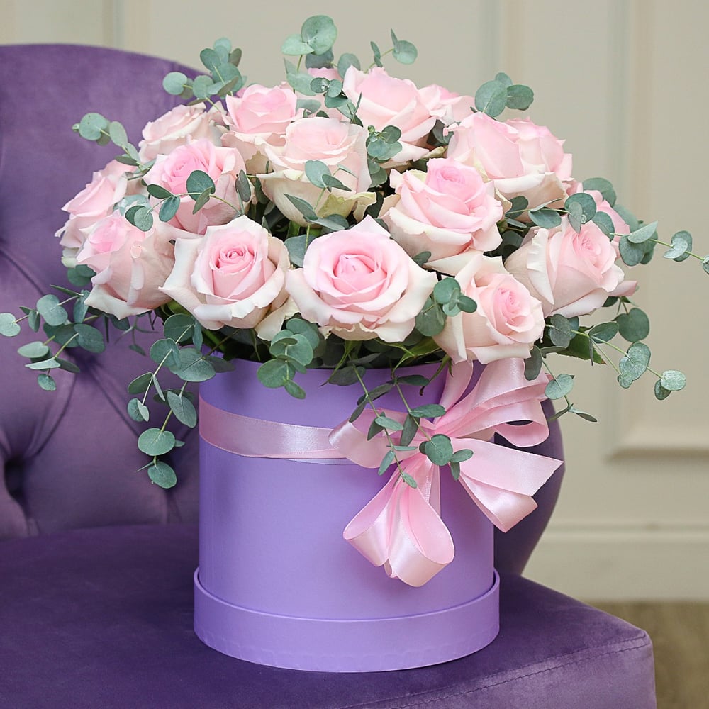 Этот утонченный букет состоит из изысканных розовых роз, дополненных ароматным эвкалиптом. Композиция представлена в элегантной шляпной коробке, украшенной белой лентой. Оазис в упаковке обеспечивает долгий срок свежести цветов. Этот букет станет прекрасным подарком для любого случая.