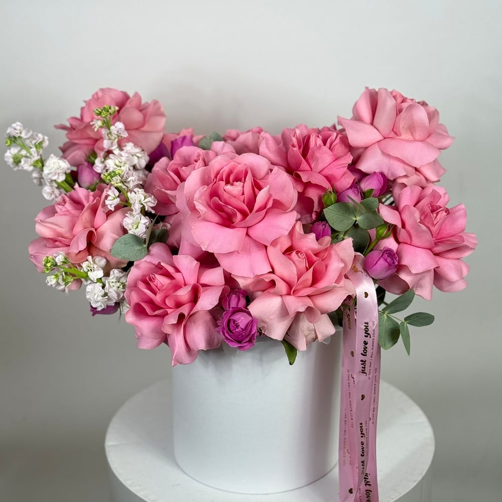Шляпная коробка с цветами «Розовое сияние» из маттиолы