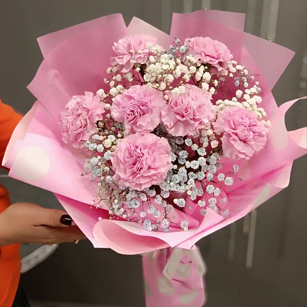 Букет из диантусов и гипсофилы будет долго радовать свежестью и станет замечательным подарком для девушки, девочки