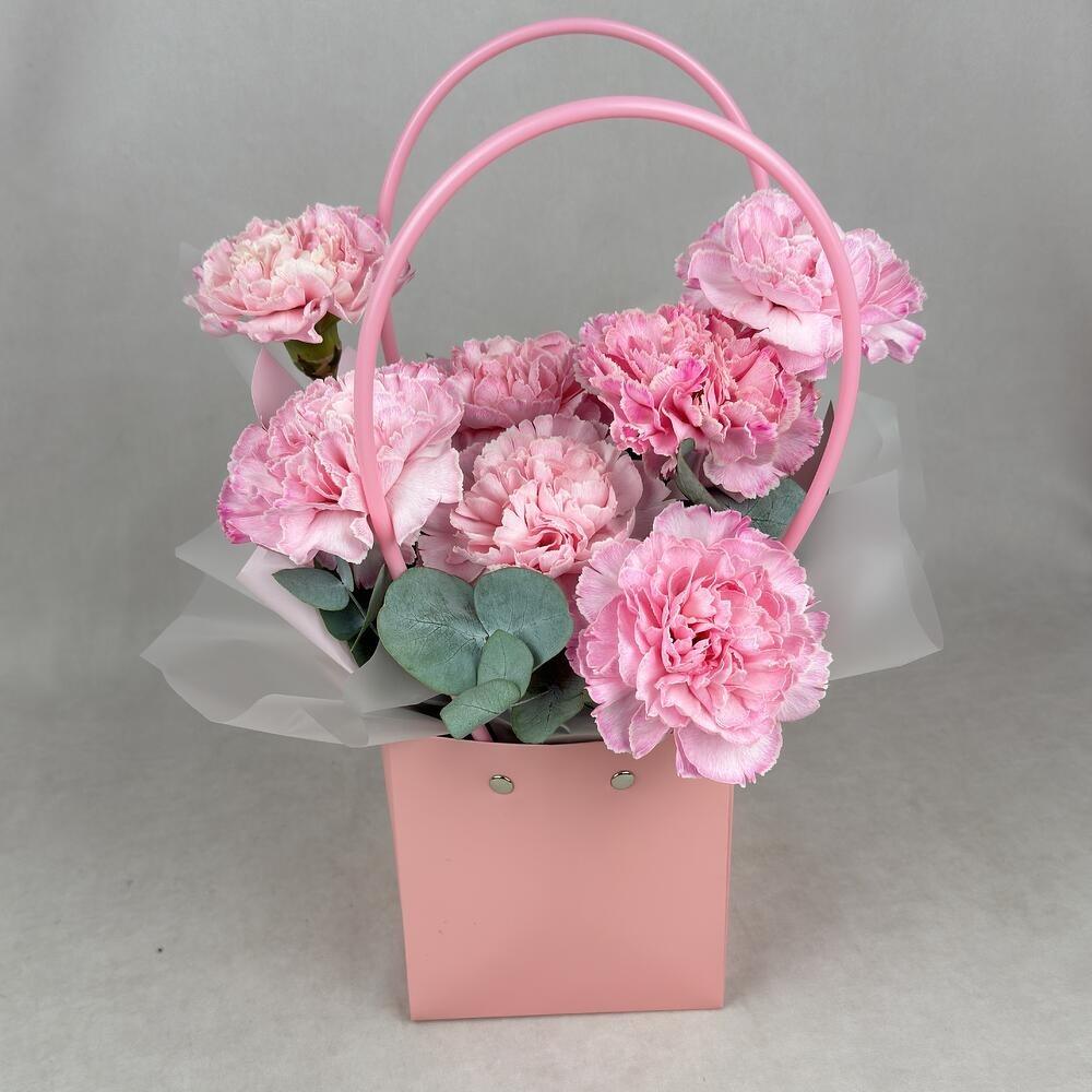 Элегантный букет собранные в розовой сумочке, изысканное сочетание семи нежных розовых диантусов, дополненных свежей зеленью эвкалипта. Эта композиция в стильной розовой сумочке идеально подойдет д...