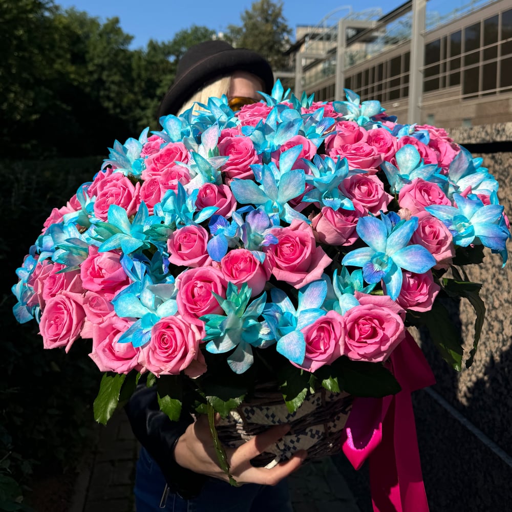 Орхидея дендробиум - 60 шт роза розовая 75 шт Колба для орхидей - 60 шт Оазис флористический - 2 шт Корзина - 1 шт Тишью - 1 шт