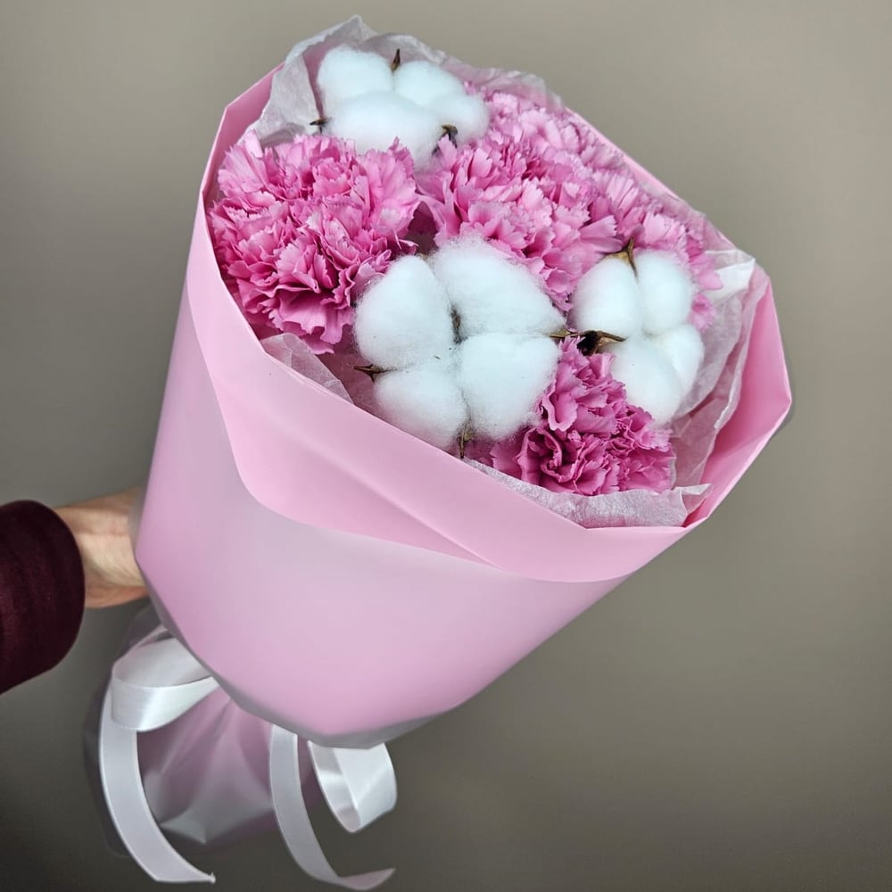 Нежный, и в то же время яркий букет из долгоиграющих диантусов и хлопка