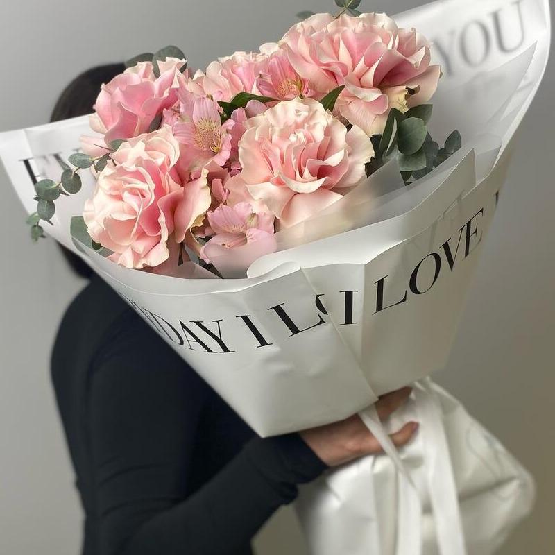 Розовый букет из французских роз из альстромерий