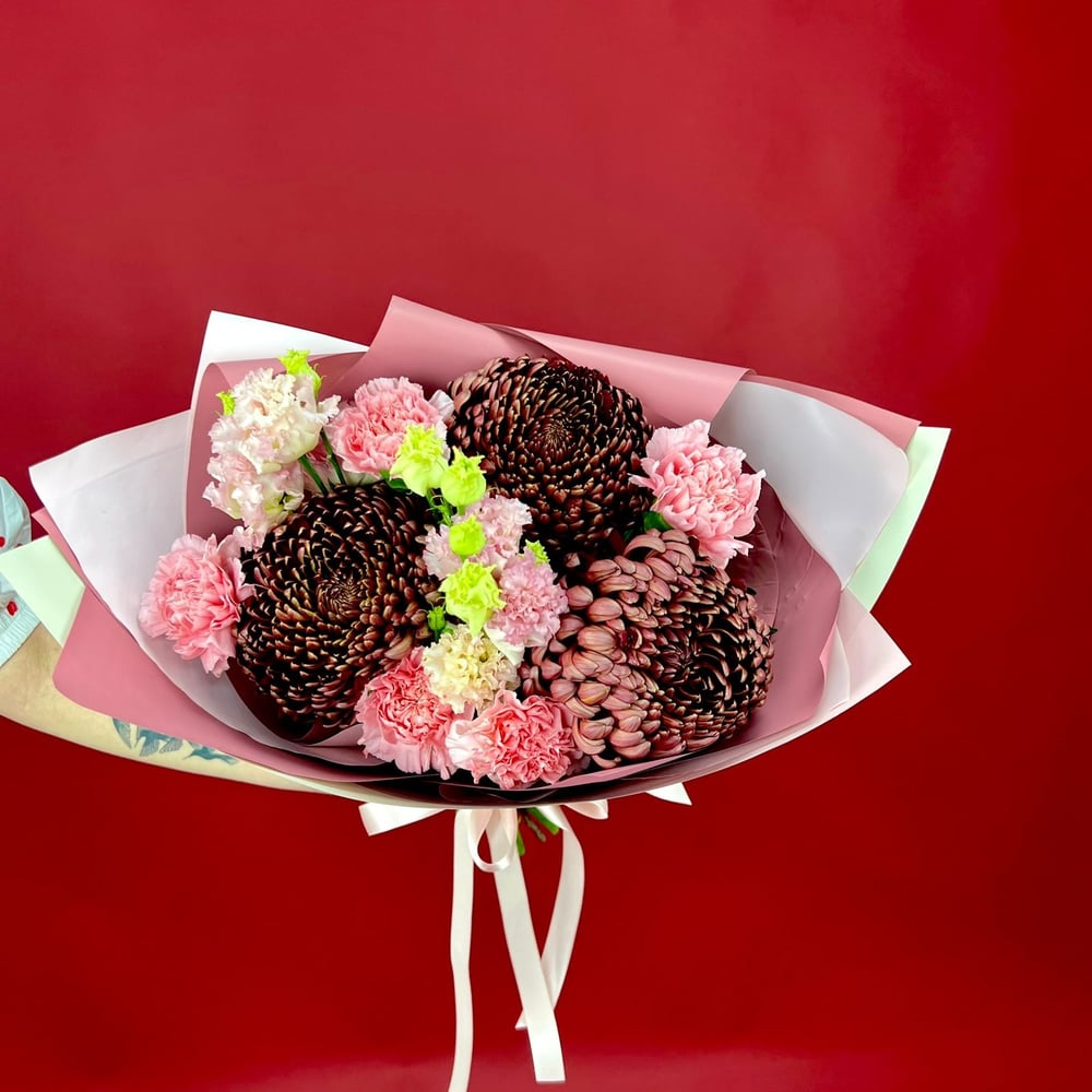 Шикарные крупные хризантемы бигуди-акцентный цветок в этом букете! Мы знаем, что Вы хотите порадовать своих близких нежными букетами, но при этом удивить их! Поэтому предлагаем Вам сочетание из нежных розовых диантусов и махровой кустовой эустомы с винными крупными хризантемами бигуди, которые еще долго будут радовать получателя! Это именно тот букет, который останется в памяти надолго!
