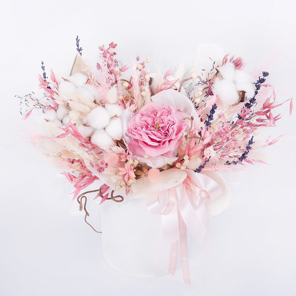 Букет в коробочке «Розовый кварц» — это нежное и изысканное сочетание пионовидных роз, сухоцветов и хлопковых бутонов, которое подарит получателю ощущение лёгкости и воздушности. Букет «Розовый квар…