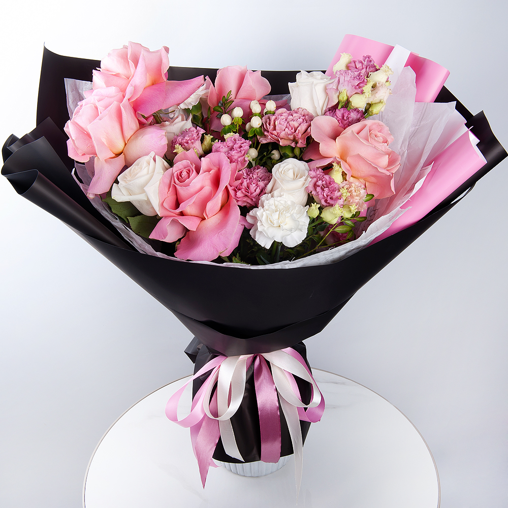 Букет «Розовый меланж» — это воплощение нежности и элегантности, созданное из самых изысканных цветов. В букете сочетаются белые и розовые эквадорские розы, гвоздики, лизиантусы, гиперикумы и фист...