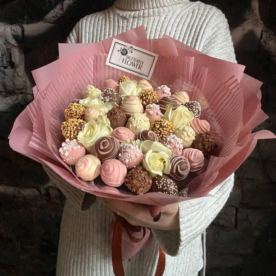 Съедобный фруктовый букет из клубники в шоколаде и роз в стильной упаковке.