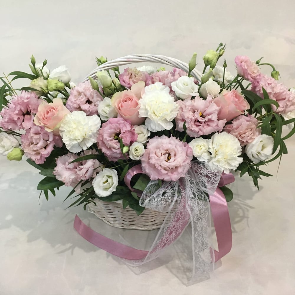 Корзина с цветами «Розовый туман» из эустом и гвоздик