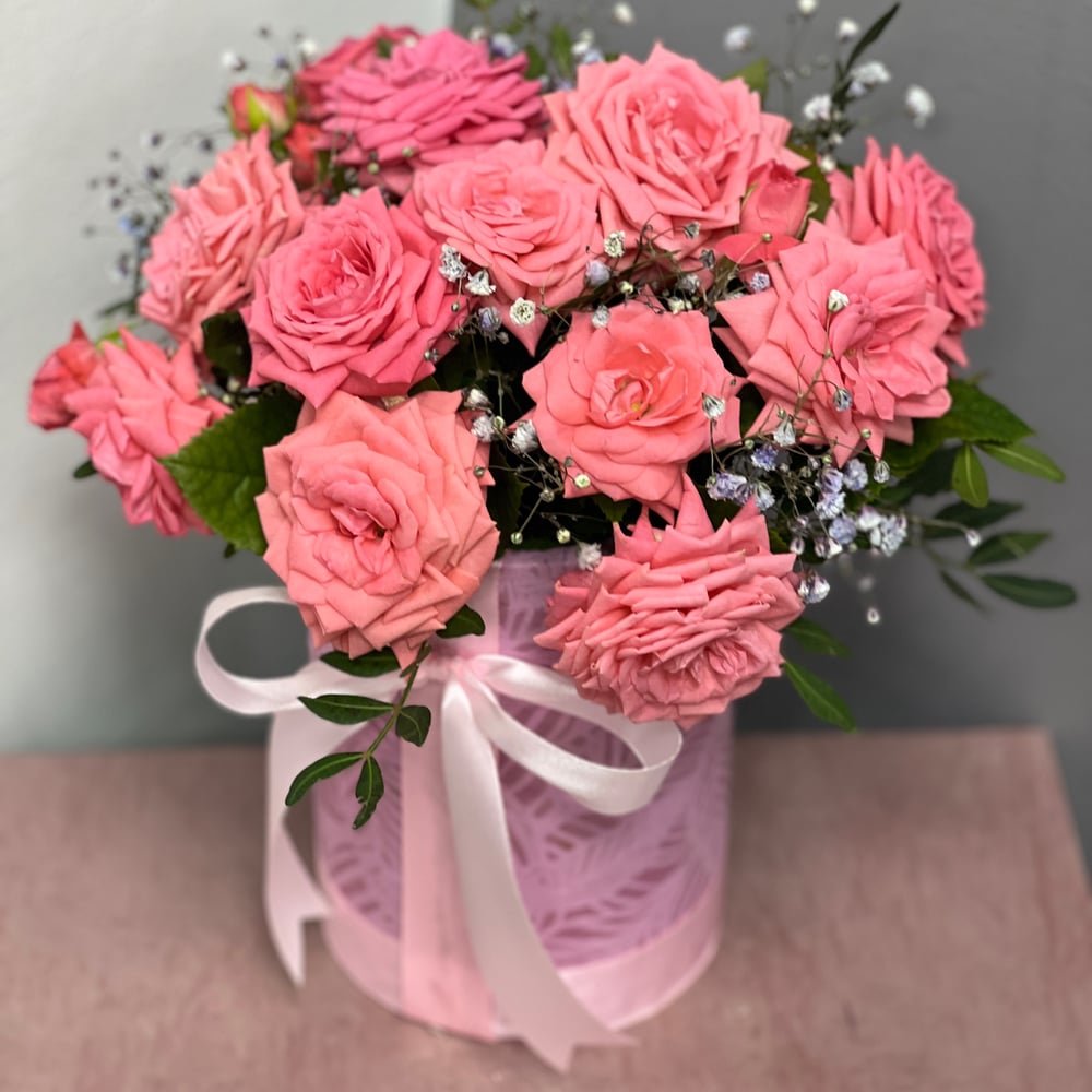 Шляпная коробка с цветами «Розовый закат» из гипсофил