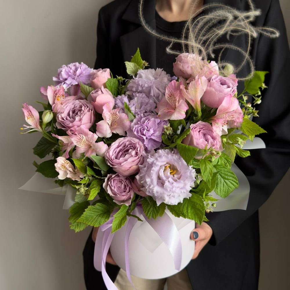 Шляпная коробка с цветами «Лавандовая композиция: розы и эустома»