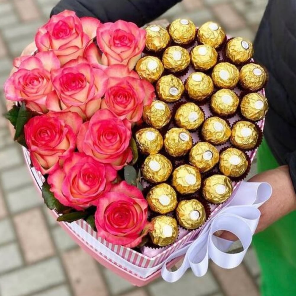 Шикарные, ароматные розы и вкуснейшие конфеты «Ferrero Rocher» в коробке-сердце - дарят незабываемые эмоции получательнице