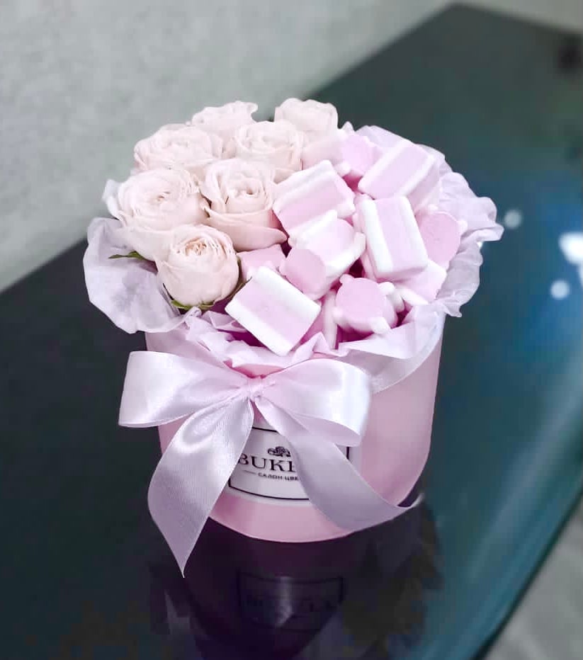 Состав Роза пионовидная кустовая – 7 шт. Маршмеллоу – 25 шт. Коробка шляпная (D13x13) – 1 шт. Лента атласная – 1 шт. Оазис флористический – 1 шт.