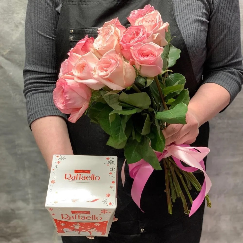 букет из 11 розовых роз и коробочка популярных конфет рафаэлло