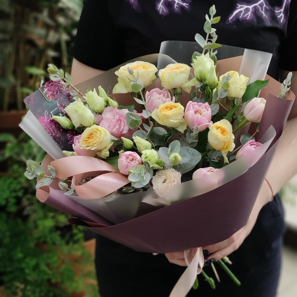 Нежный букет с кустовой розой и пионовидными тюльпанами.