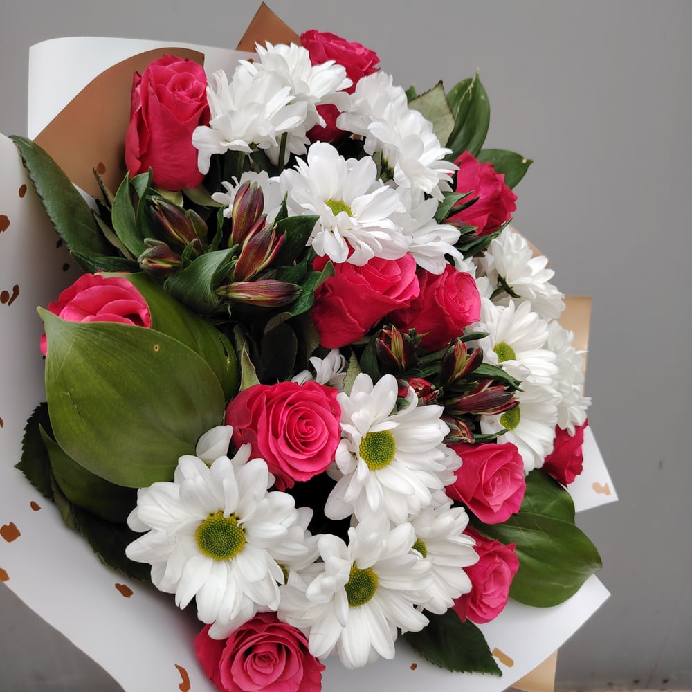 Яркий букет из роз, альстромерий и хризантемы. Подойдёт для любого повода.