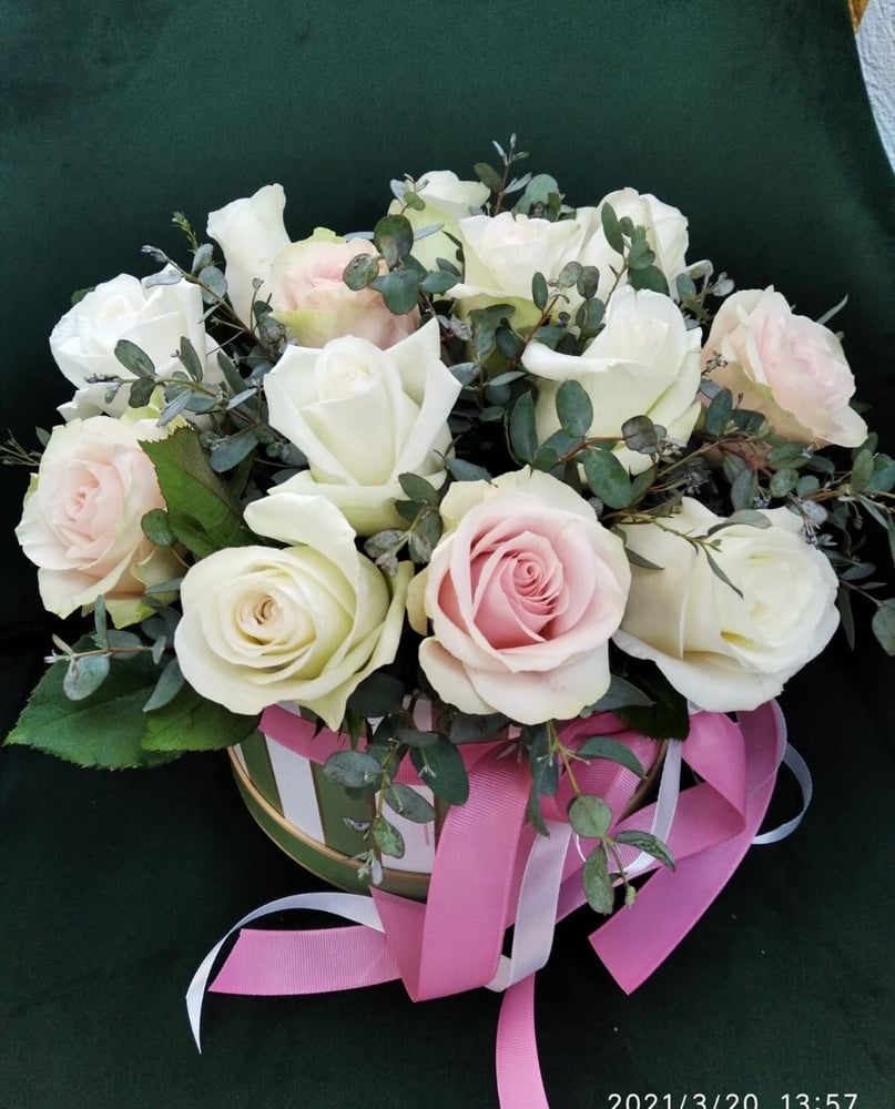 Розы в коробке с благородным эвкалиптом. Смотрятся нежно и изящно.