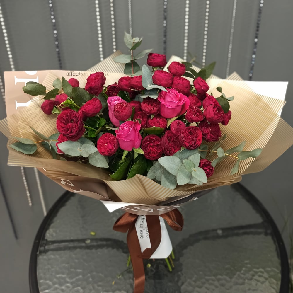 Объемный, стильный букет из кустовых пионовидных роз сорта Ред Пиано в элегантной дизайнерской упаковке.