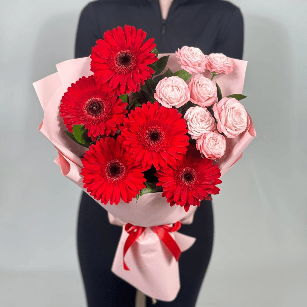 Букет «Рубиновый блеск» из гербер и роз