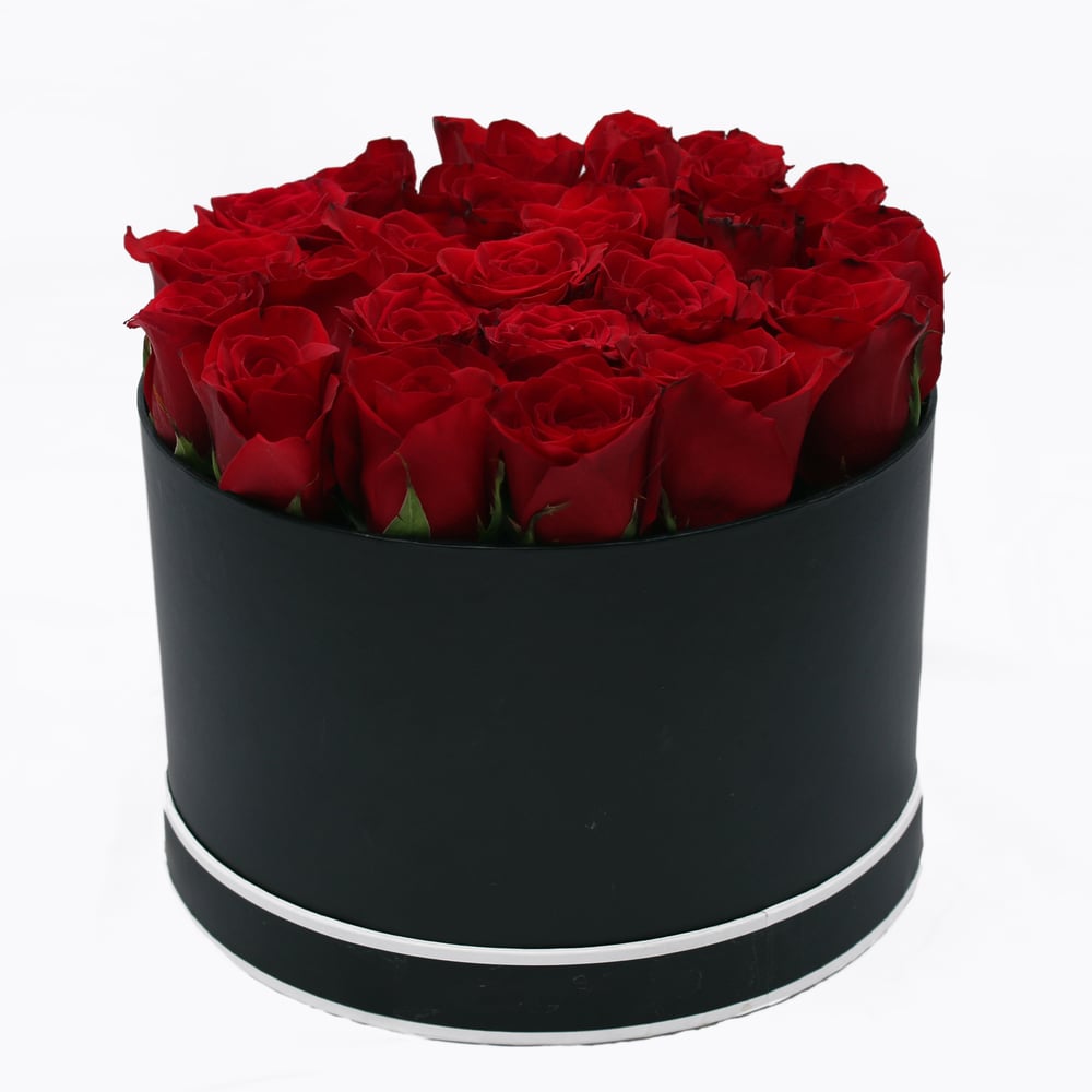 Классика - это черная шляпная коробка и рубиновые розы.