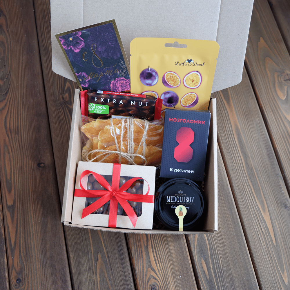 В наборе: 📌Коробка 17,5*17*8,5 см 📌Головоломка 📌Арахис в шоколаде 📌Манго сушеное лепестки 📌Маска тканевая для лица 📌Шоколад Ritter Sport 📌Крем-мед 120 гр (вкусы разные) 📌Открытка