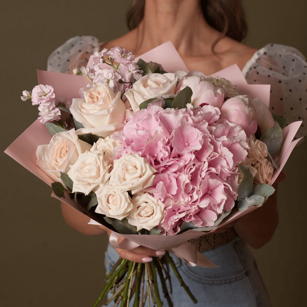 Этот букет — изысканный и нежный подарок для особого случая. Гортензия придаст букету неповторимый шарм своими большими соцветиями, цвет которых может варьироваться от белого до фиолетового оттенка…