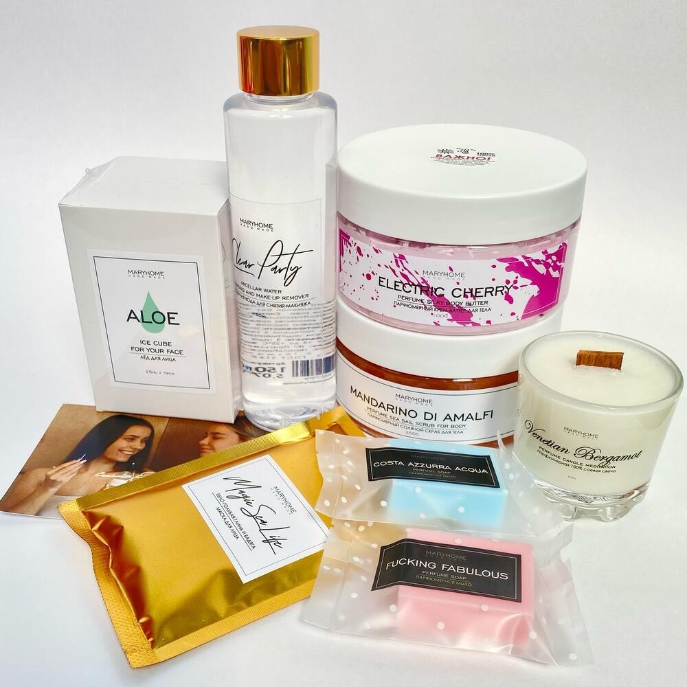 Побалуй себя приятной покупкой или сделай подарок близкому человеку. Описание набора: 1. Лёд для кожи лица Ice cube for your face, 25ml * 7pcs; 2. Мицелярная вода “Clear Party”Micellar water cleansing and make-up remover, 150ml; 3. Маска для лица “Magic Sea Life” с белой глиной и бодягой, 40g; 4. Парфюмерное мини-мыло, 17g - 2шт; 5. Парфюмерная свеча Perfume Candle Meditation, 50g; 6. Питательный крем-баттер, 100гр; 7. Парфюмированный скраб для тела Love for Bath, 350g; 8. Подарочная, качественная коробка с атласной лентой, прекрасно впишется в ваш интерьер. Закажи свою коробочку красоты и протестируй качественные парфюмерные средства, представленные в нашем магазине. Набор собирается в MIX Ароматов.