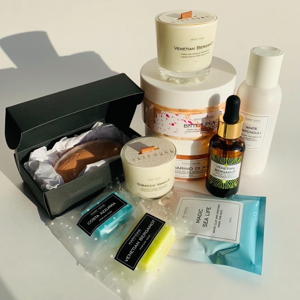 Побалуй себя приятной покупкой или сделай подарок близкому человеку. Описание набора: Парфюмерное масло Увлажнение, питание и восстановление, 30ml Парфюмерная свеча Perfume Candle Meditation, 50g, 2шт Маска для лица “Magic Sea Life” с белой глиной и бодягой, 45g Парфюмерное Кокосовое масло для тела, 100ml Парфюмерное мини-мыло, 17g - 2шт Питательный крем-баттер, 100гр Парфюмированный скраб для тела Love for Bath, 350g Парфюмерное мыло,105g Подарочная, качественная коробка с атласной лентой, прекрасно впишется в ваш интерьер Закажи свою коробочку красоты и протестируй качественные парфюмерные средства, представленные в нашем магазине. Набор собирается в MIX Ароматов.