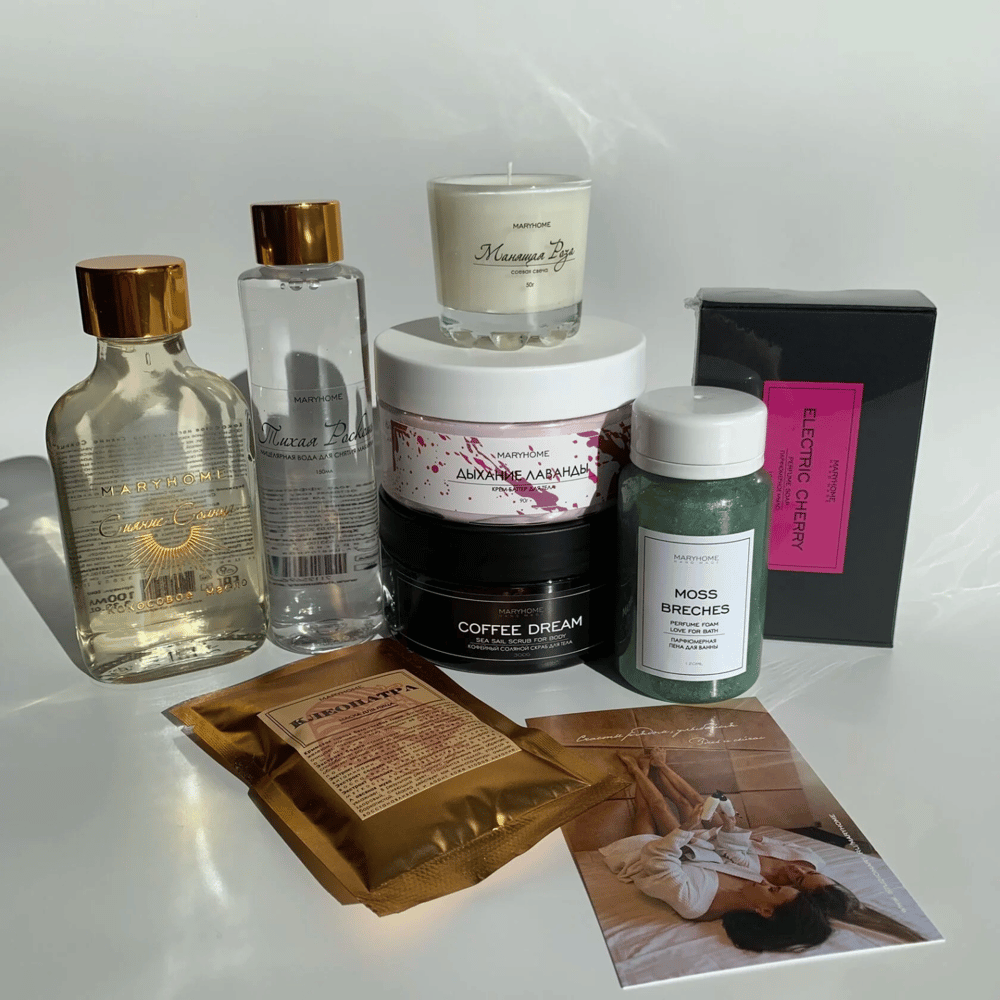 Побалуйте себя приятной покупкой или сделайте подарок близкому человеку. Описание набора: 1. Пена для ванны, 120мл; 2. Мицеллярная вода,150мл; 3. Свеча, 50г; 4. Крем-баттер, 100г; 5. Скраб дл…