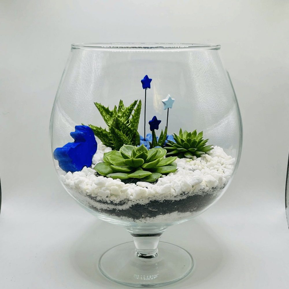 "Сад голубых звезд" — это не просто флорариум, а тихое пространство спокойствия и мечты. Тот самый момент, когда мир замедляется, мысли становятся светлее, а чудо ощущается почти физически — без повода и дат. В прозрачном бокале раскинулся миниатюрный сказочный ландшафт:три суккулента, похожие на крошечные вечнозелёные деревья,белый грунт, словно покрытый лёгким сиянием,синие декоративные камушки — как глубина прохладного озера, и три блестящие звезды, будто упавшие с далёкого неба. Рядом — синий сказочный заяц. Тихий хранитель уюта и внутреннего покоя. Он словно напоминает: чудеса не обязательно бывают громкими — иногда они просто живут рядом, в красивых деталях и ощущении гармонии. Этот флорариум наполняет пространство ощущением уюта, чистоты и нежной сказочности. Подарок, который остаётся надолго и каждый день радует взгляд — как маленький мир, в котором всегда спокойно. Подарите частичку зимнего чуда — «Сад голубых звезд» создаёт настроение, стоит лишь на неё взглянуть.