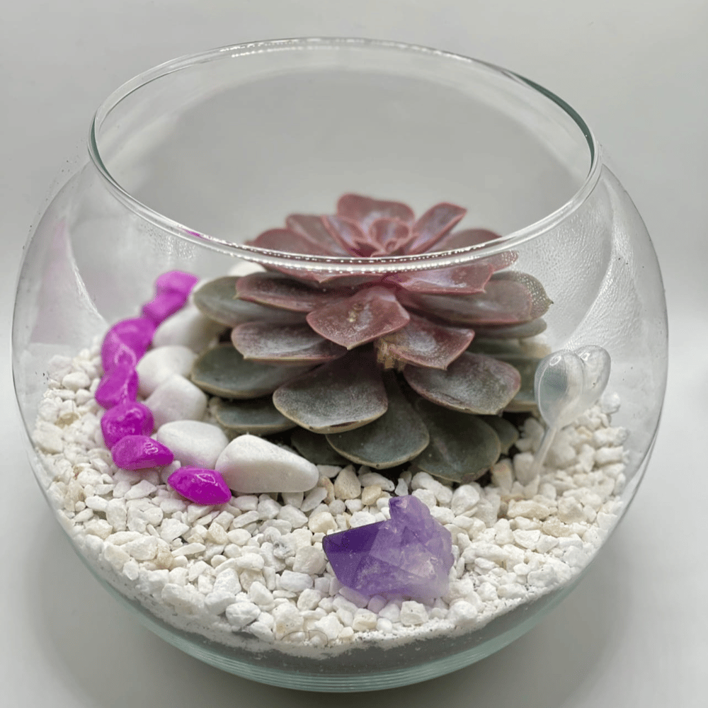 Этот флорариум — как тихая медитация, заключённая в стеклянный шар. В центре композиции — крупная эхеверия с мягким розовым оттенком, символизирующая живую нежность и устойчивость. Её лепестки словно собраны из заката, излучают спокойствие и природную красоту. Почва покрыта мраморной крошкой, между которой лежат декоративные камни, а сердце этого сада в стекле украшает кристалл необработанного аметиста из Бразилии — лавандовый, прозрачный, живой. Аметист — камень душевного равновесия. Он символизирует искренность и внутренний покой, помогает справиться с тревогой и наполняет пространство гармонией. Мы добавили его не случайно — чтобы флорариум стал не просто красивым интерьерным акцентом, а настоящим оберегом от суеты, источником вдохновения и света. Такой флорариум с эхеверией и аметистом — идеальный подарок девушке, женщине, маме или себе, если хочется красоты, уюта и внутреннего равновесия. Он не требует сложного ухода и долго остаётся живым украшением дома, радуя глаз и душу. Эхеверии неприхотливы в уходе, поливать раз в 2-3 недели, для удобства полива прилагаем пипетку в форме сердца.