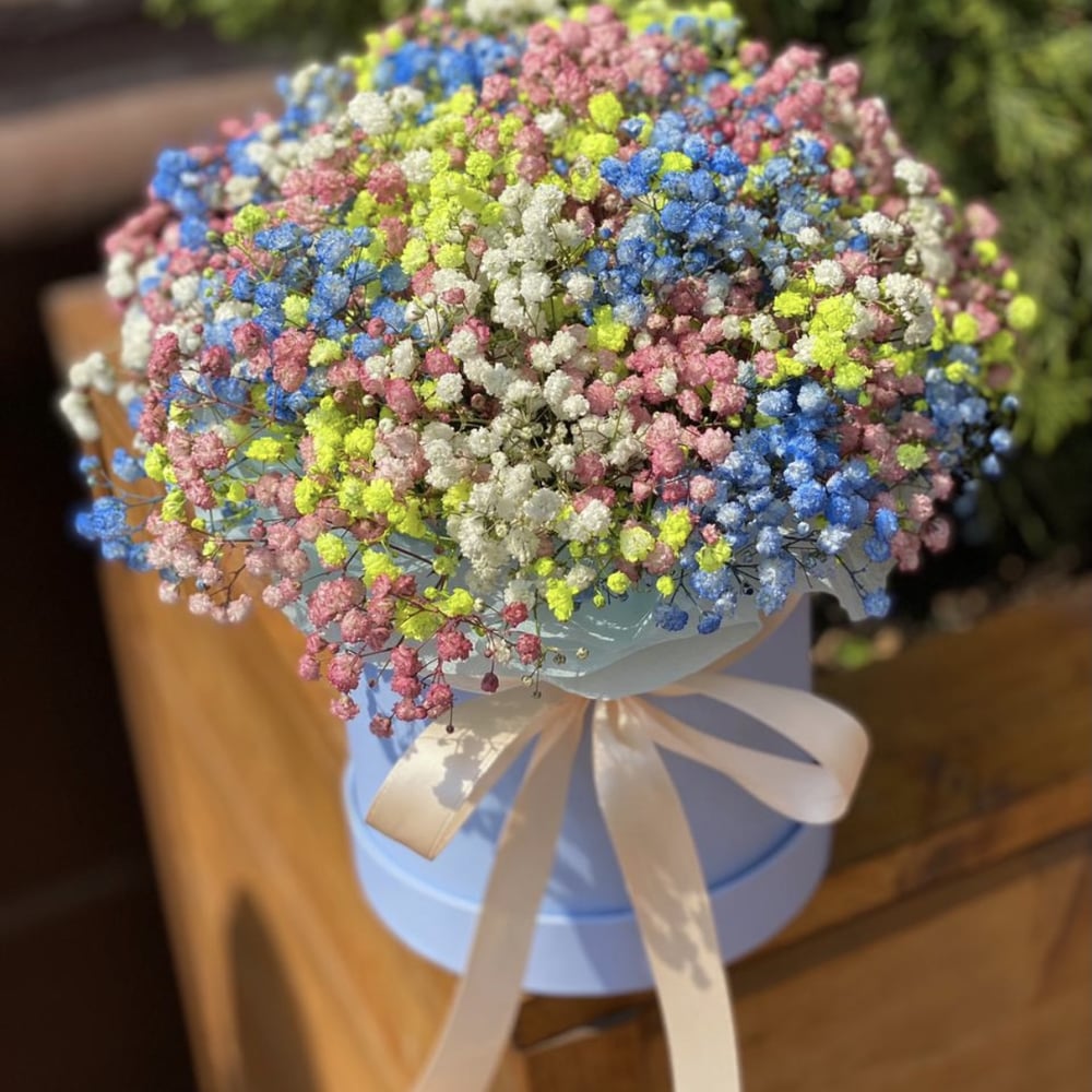 Шляпная коробка с цветами «Сахарок» из гипсофил