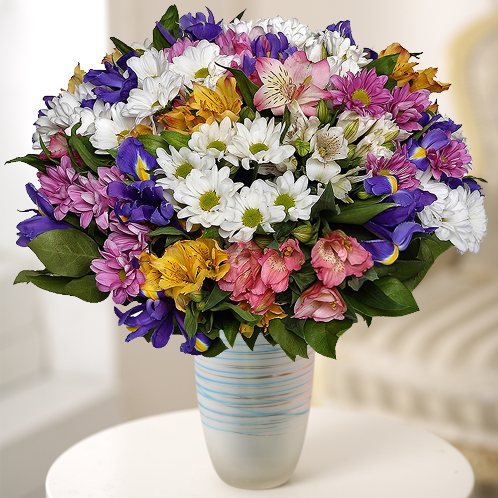 Букет состоит из смеси хризантем, ирисов, альстромерий и салала. Хризантемы придают букету яркость своими яркими цветами разных цветов. Ирисы добавляют элегантности и величественности, а их элегантны…