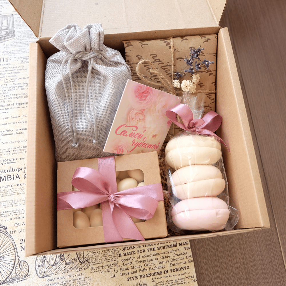 В наборе: 📌Коробка крафтовая 19*19*9 см 📌Фруктовый чай в холщовом мешочке 📌Миндаль в шоколаде 📌Зефир в виде макаронс 📌Шоколад Ritter Sport 📌Открытка