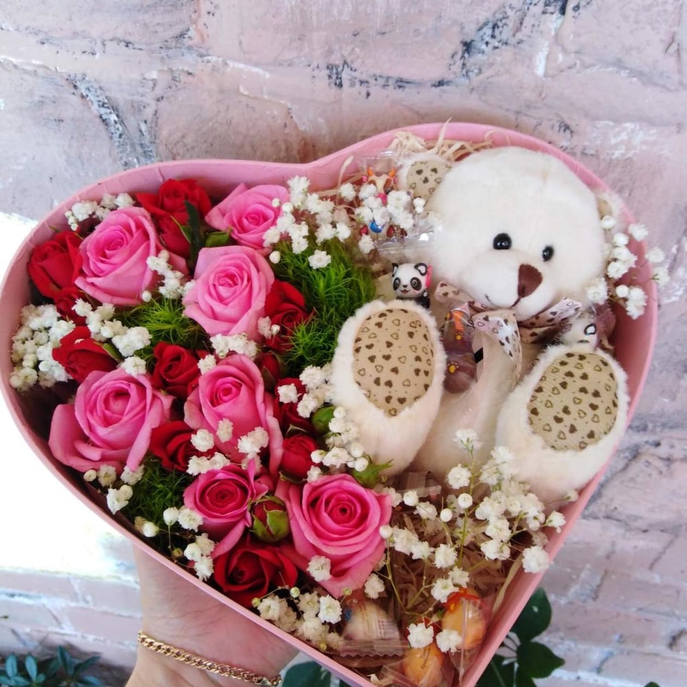 Скажи - люблю! Эта коробка сердце с цветами, вкусняшками и мягким медвежонком , сможет передать Ваши чувства!