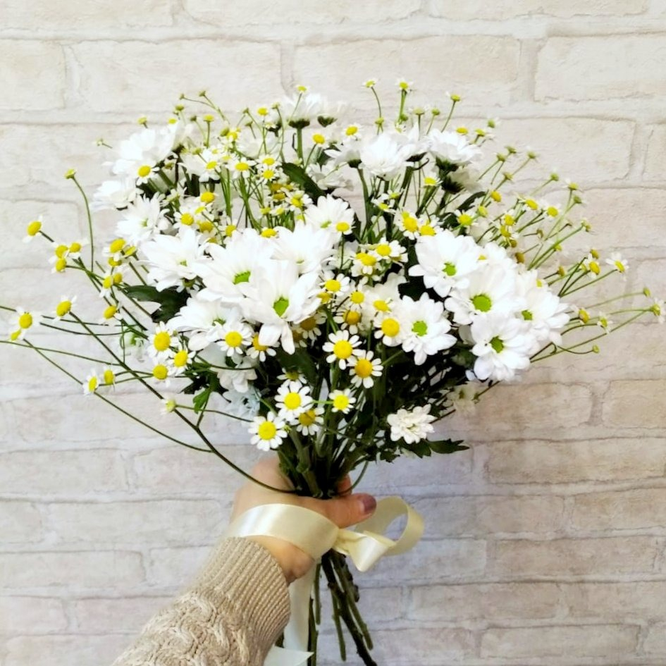 В состав данного букета входит ромашка полевая и белая сантини ромашковая, букет оформлен атласной лентой.