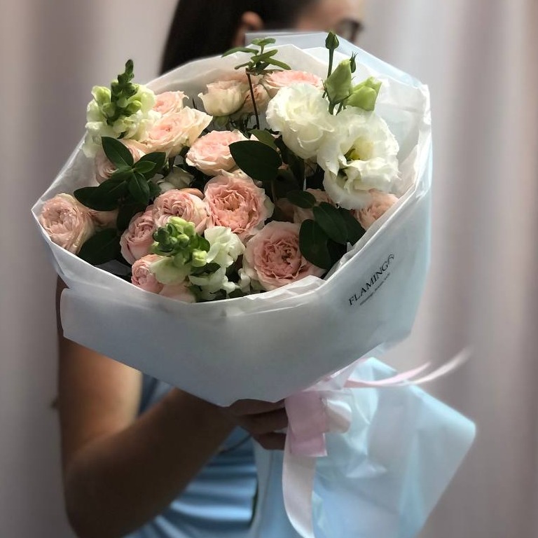 Букет в светлых оттенках из роз и антиринума.