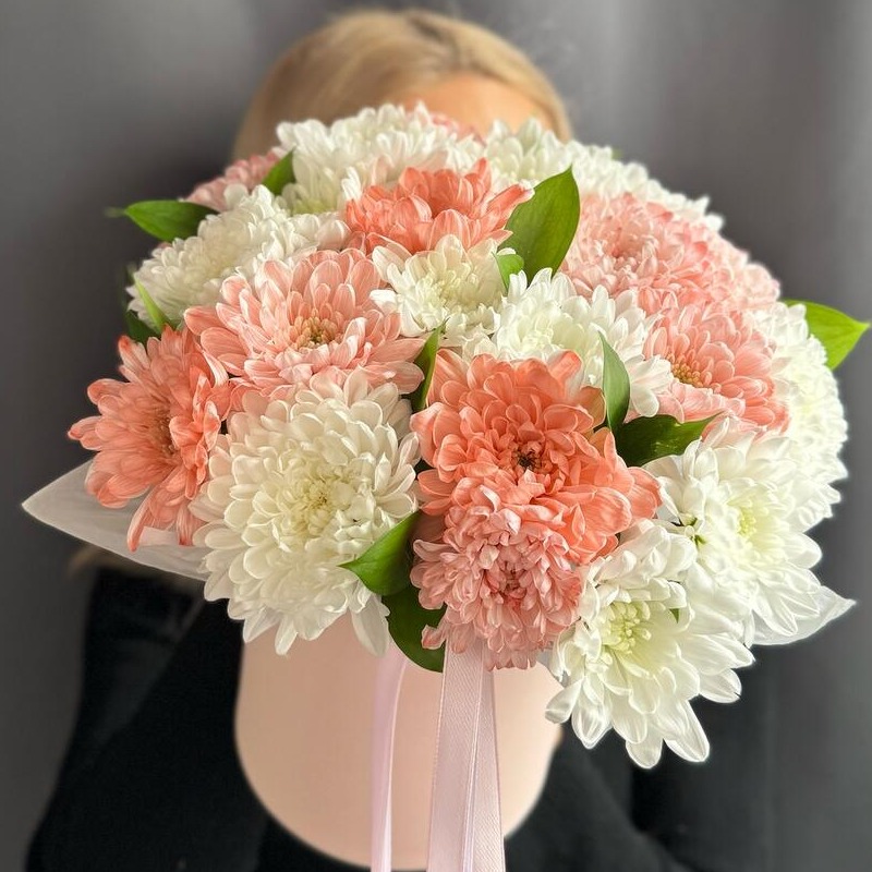 Шляпная коробка с цветами «Сборная композиция» из хризантем
