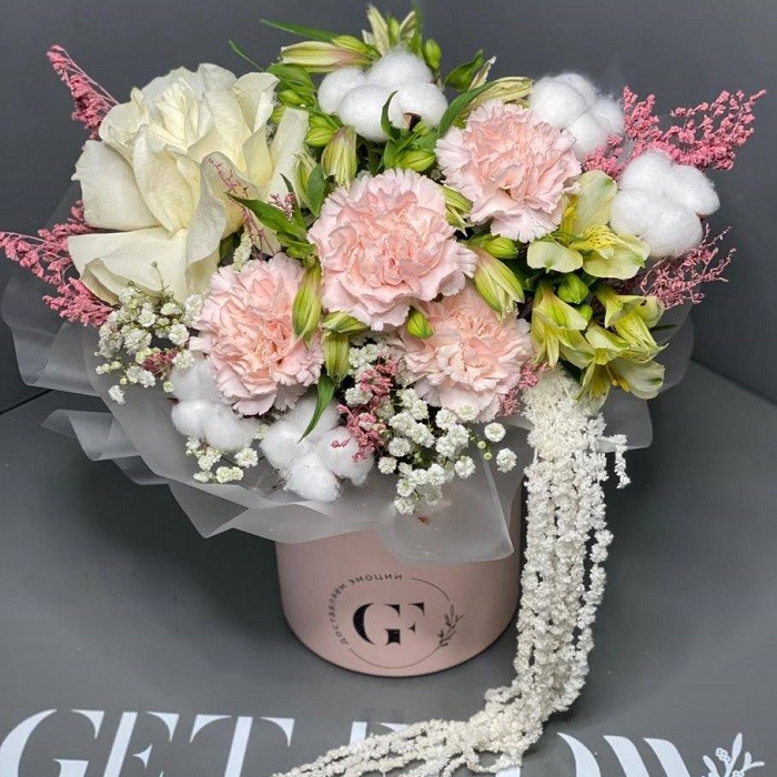 Шляпная коробка с цветами «Сборная композиция» из гвоздик и альстромерий