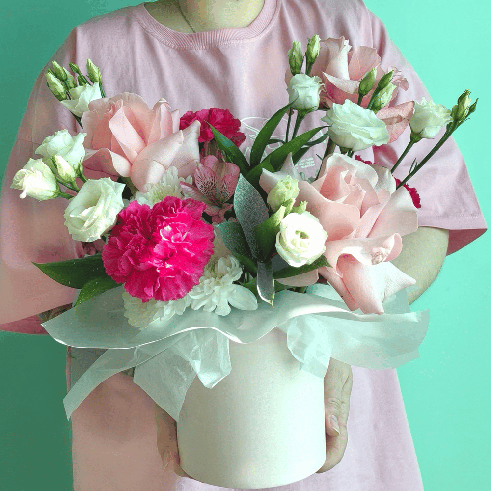 В этой очаровательной композиции сошлись лучшие: пышные французские розы, воздушные лизиантусы и милые гвоздики. Нежно, стильно, со вкусом — он украсит любой день и подарит улыбку тому, кто его получ…