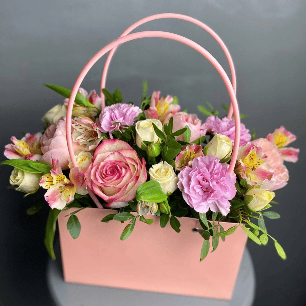 Коробка с цветами «Сборная композиция в сумочке» из роз и гвоздик