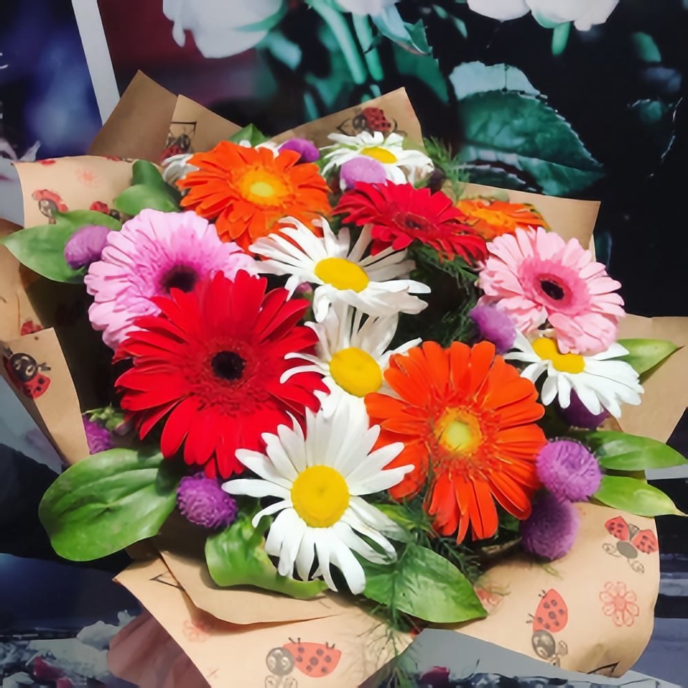 Прекрасный солнечный букетик из гербер и ромашек, в стильной упаковке. Дарите с любовью!