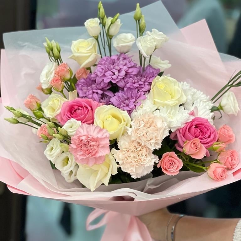 Стильный авторский букет из роз, гвоздик, хризантем и эустомы покорит сердце вашей дамы и вызовет неподдельный восторг. Бутоны разных структур и оттенков утопают в насыщенный флористической зелени, подчеркивая их красоту.